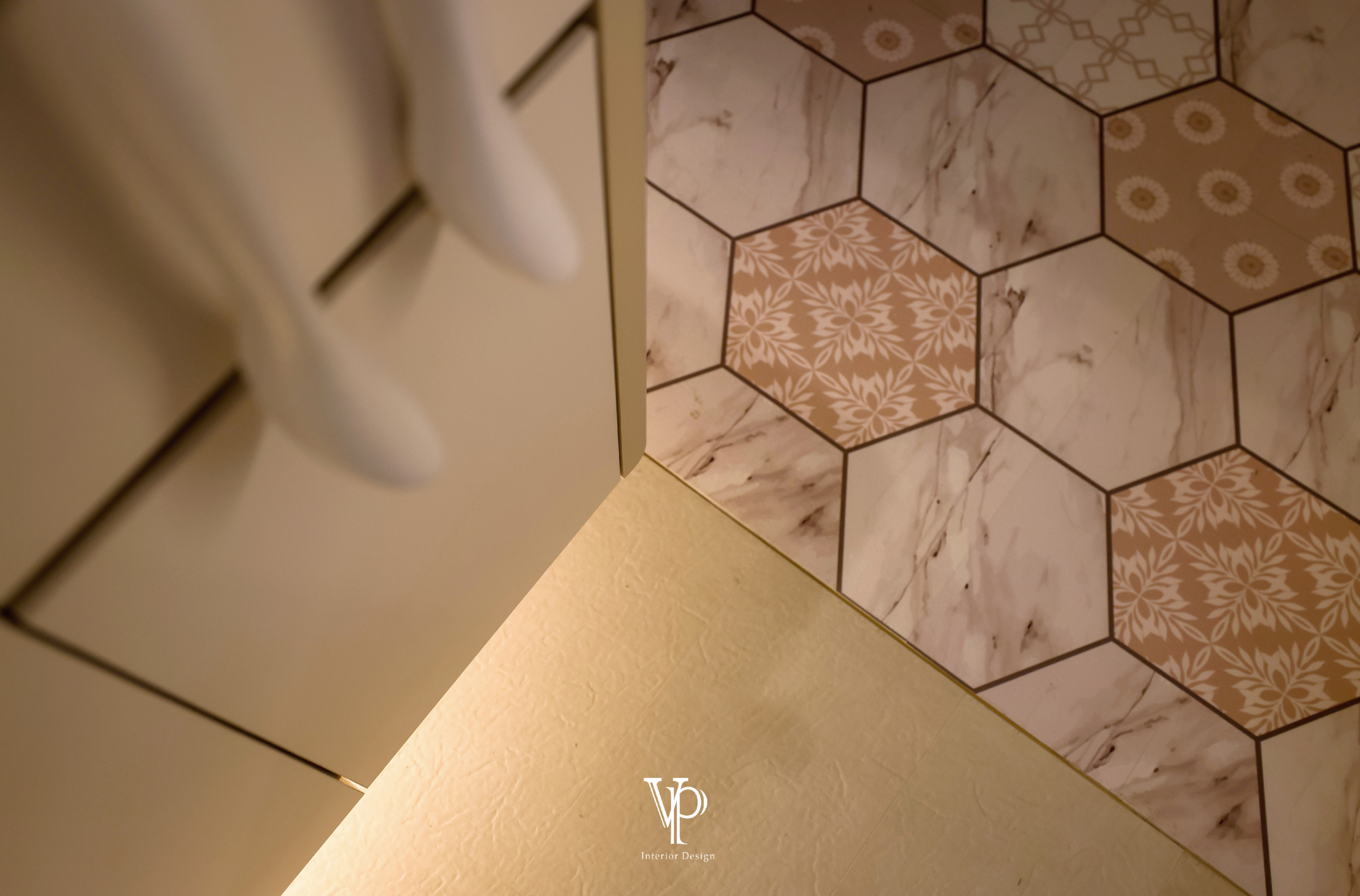 ③ 材質搭配:木作結合裝飾板與特殊塗料,搭配鐵件與金屬飾條,細膩的層次中透出光影的律動感。