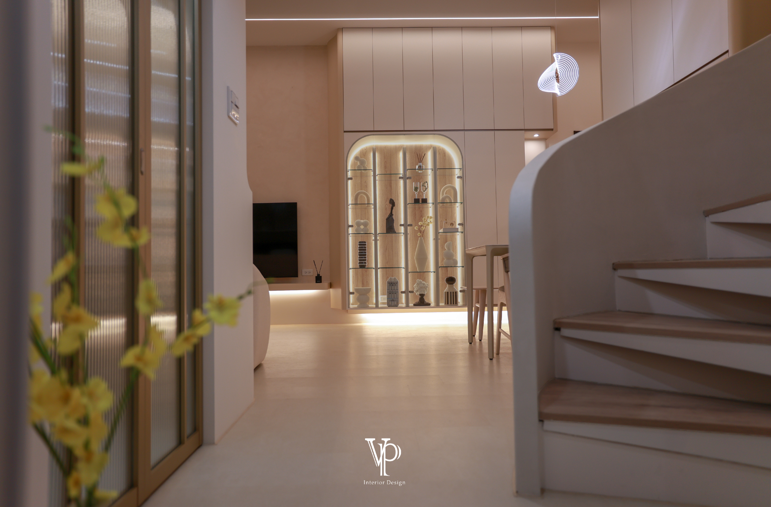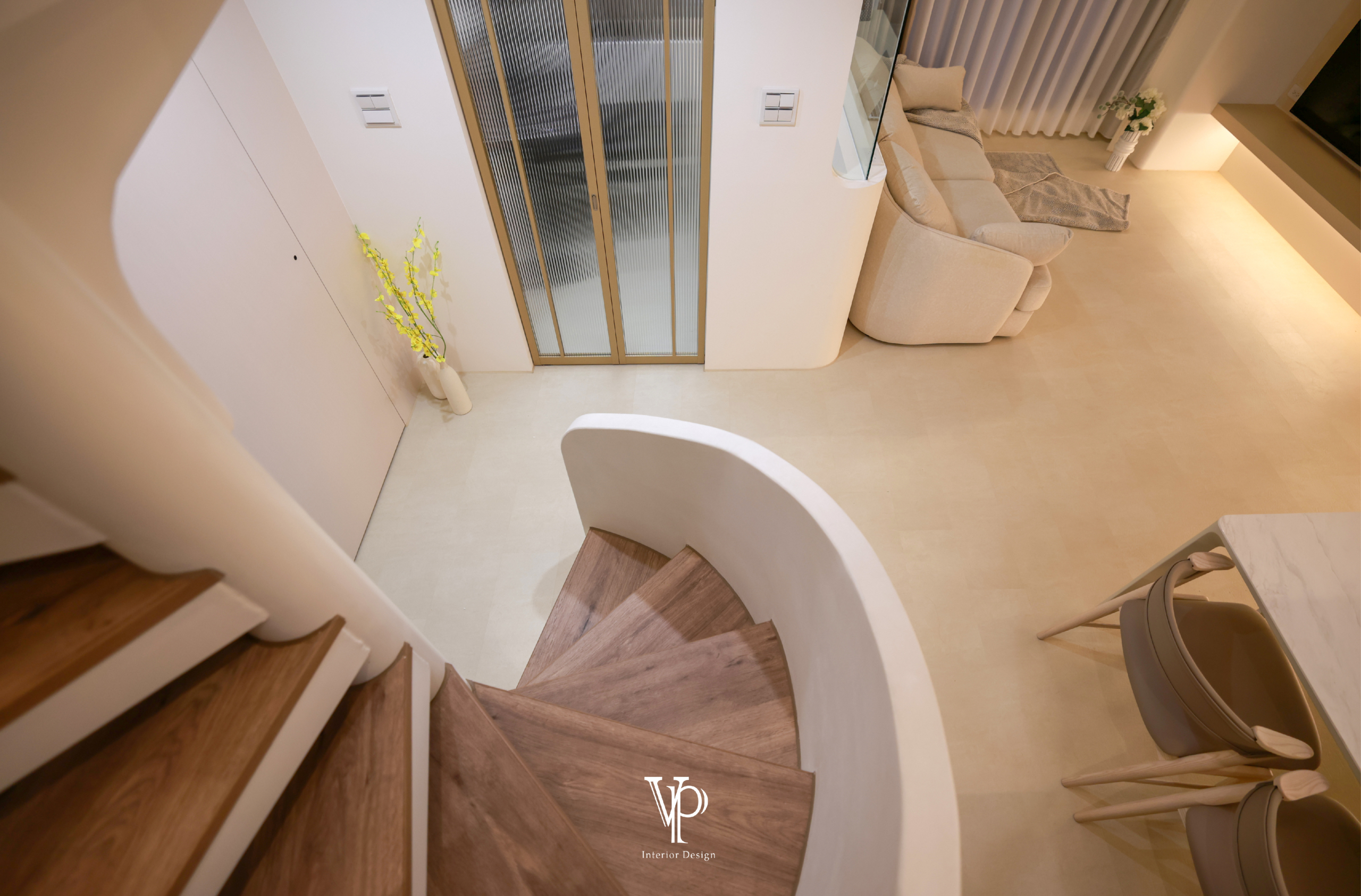 整體以自然色調鋪陳,木質的溫潤與金屬的冷冽相互平衡,展現出剛柔並濟的現代氣韻。光線映照於牆面與階梯之間,為簡約的空間注入溫度,讓家的氛圍兼具俐落與溫潤。