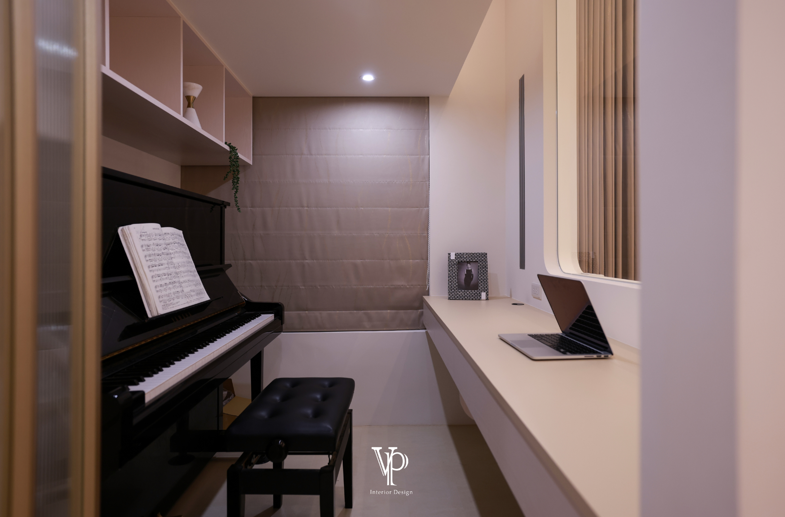 ① 空間配置:以客廳為中心,串聯餐廚與樂器書房動線;書房以玻璃介質界定,開放卻不失獨立性。