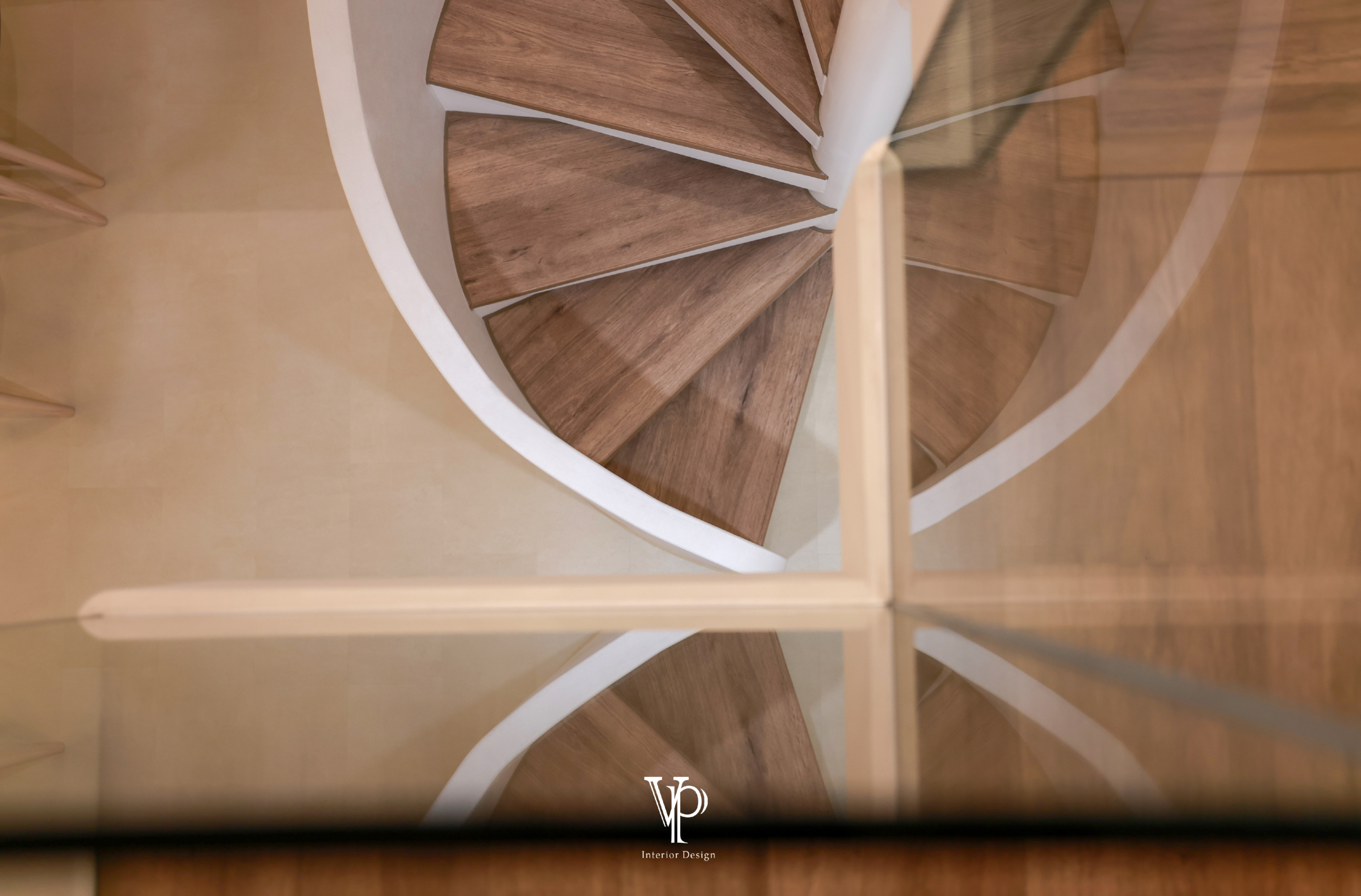以開放式公領域為核心,串聯客廳、餐廳與書房區域,讓生活的流動更顯自在。挑高客廳搭配旋轉樓梯,形成視覺焦點,延伸出豐富的垂直層次感;書房以玻璃圍塑界定,使光線能自由流動,同時保留私密與互動的平衡。