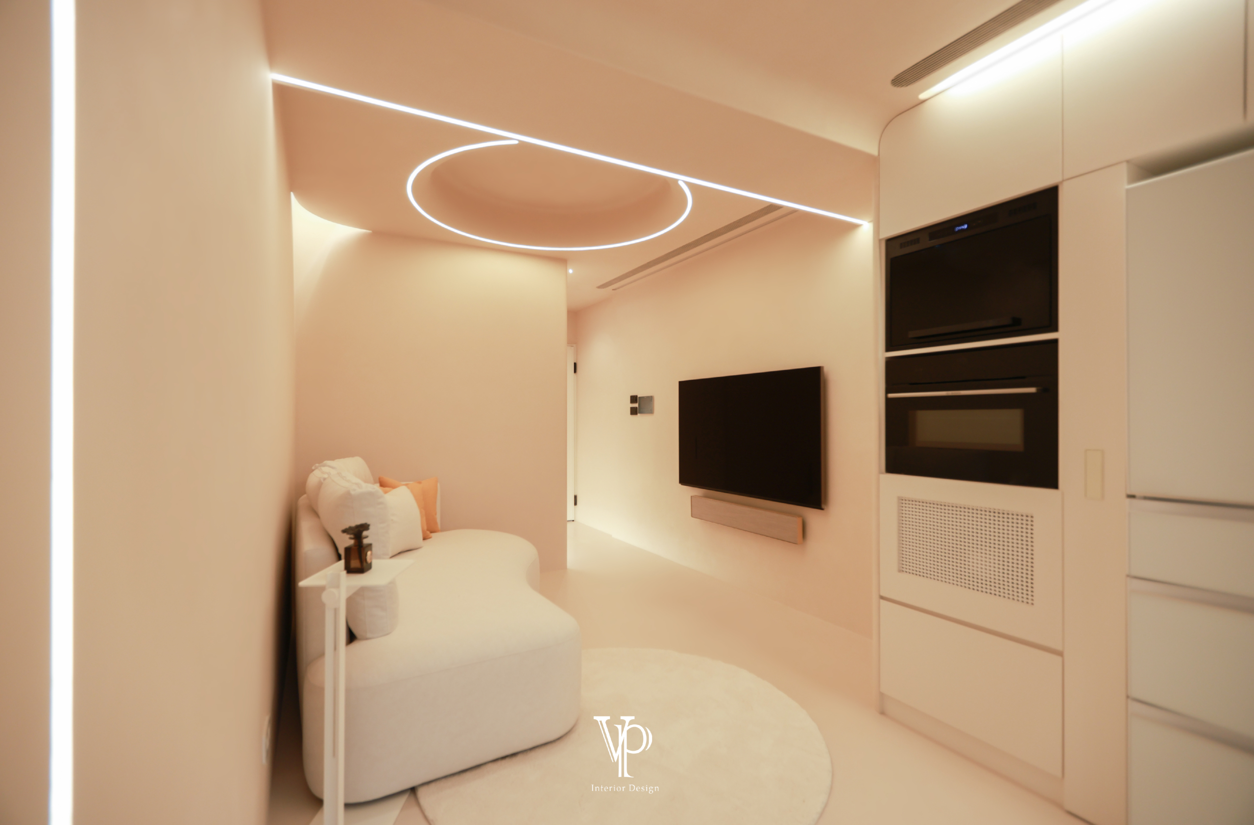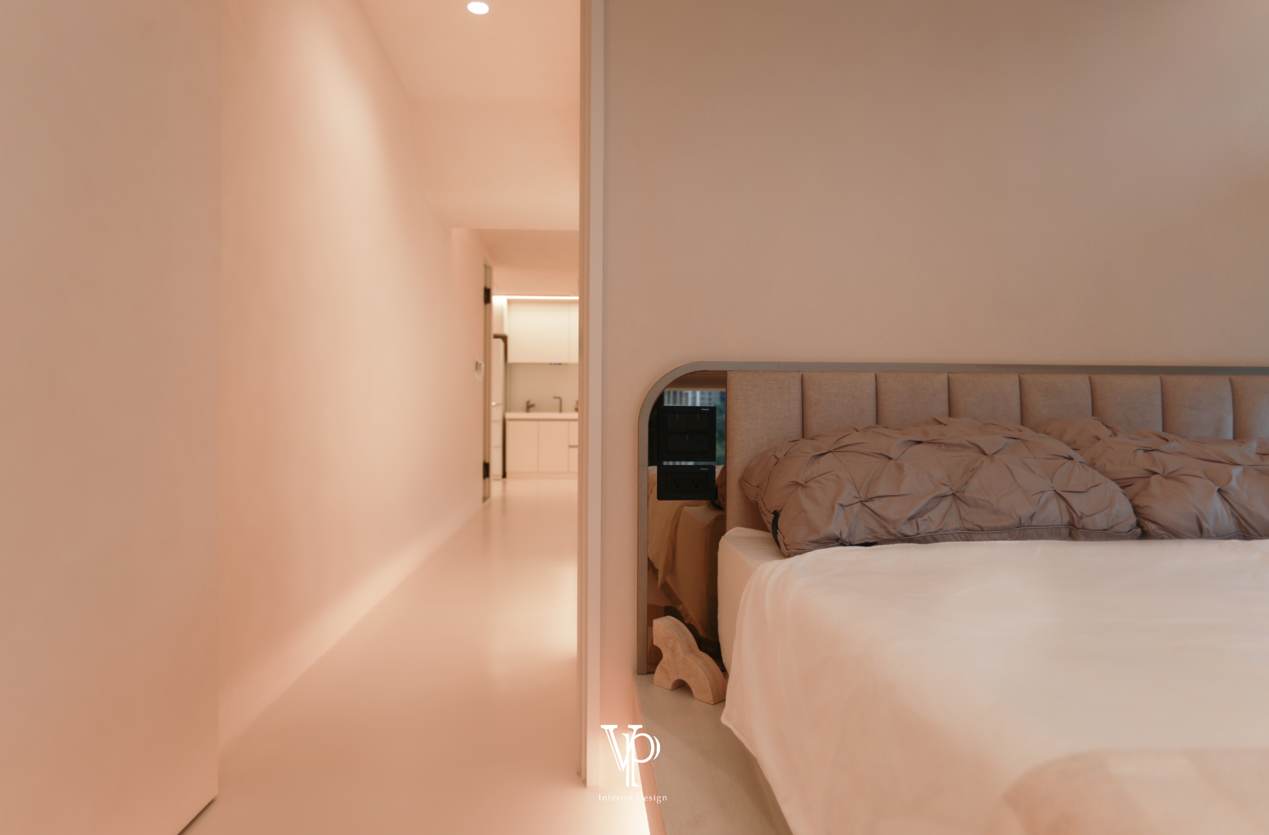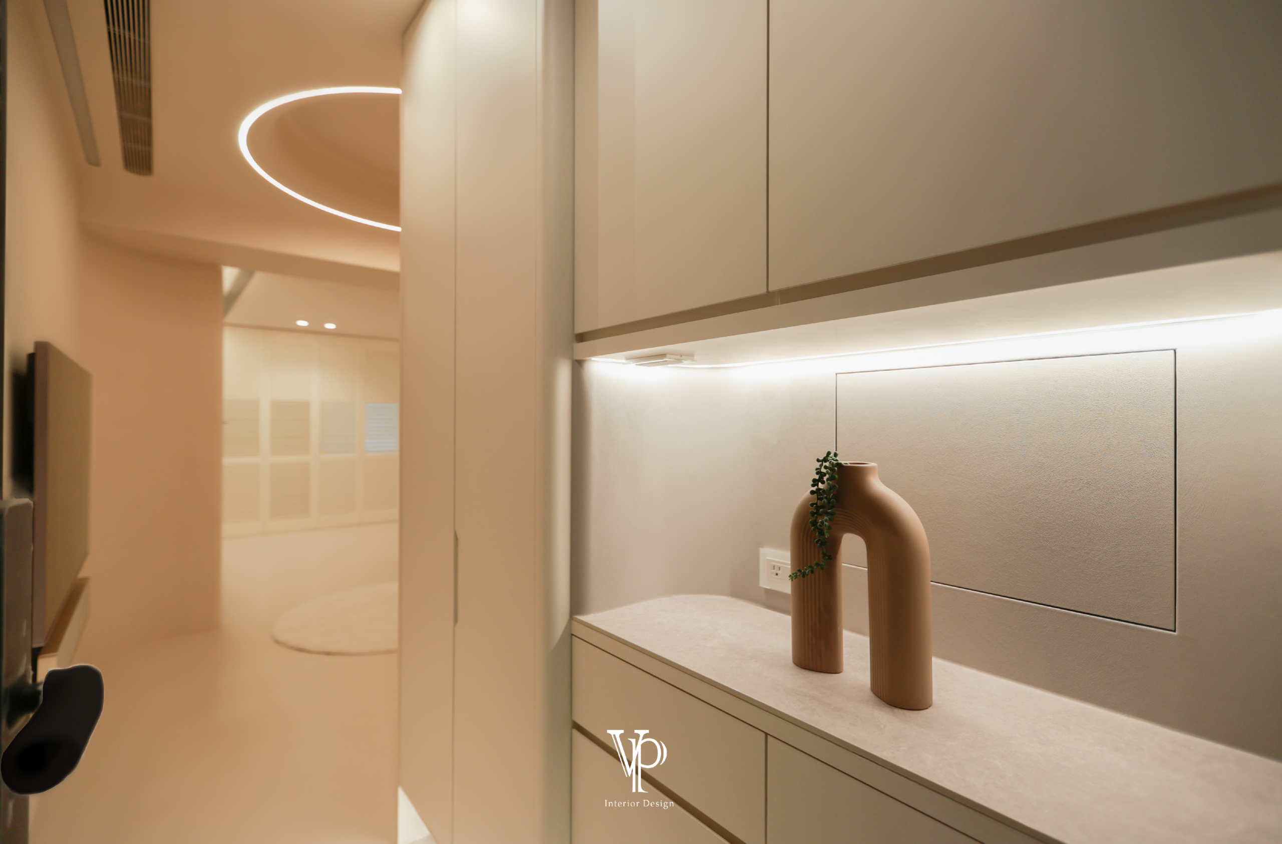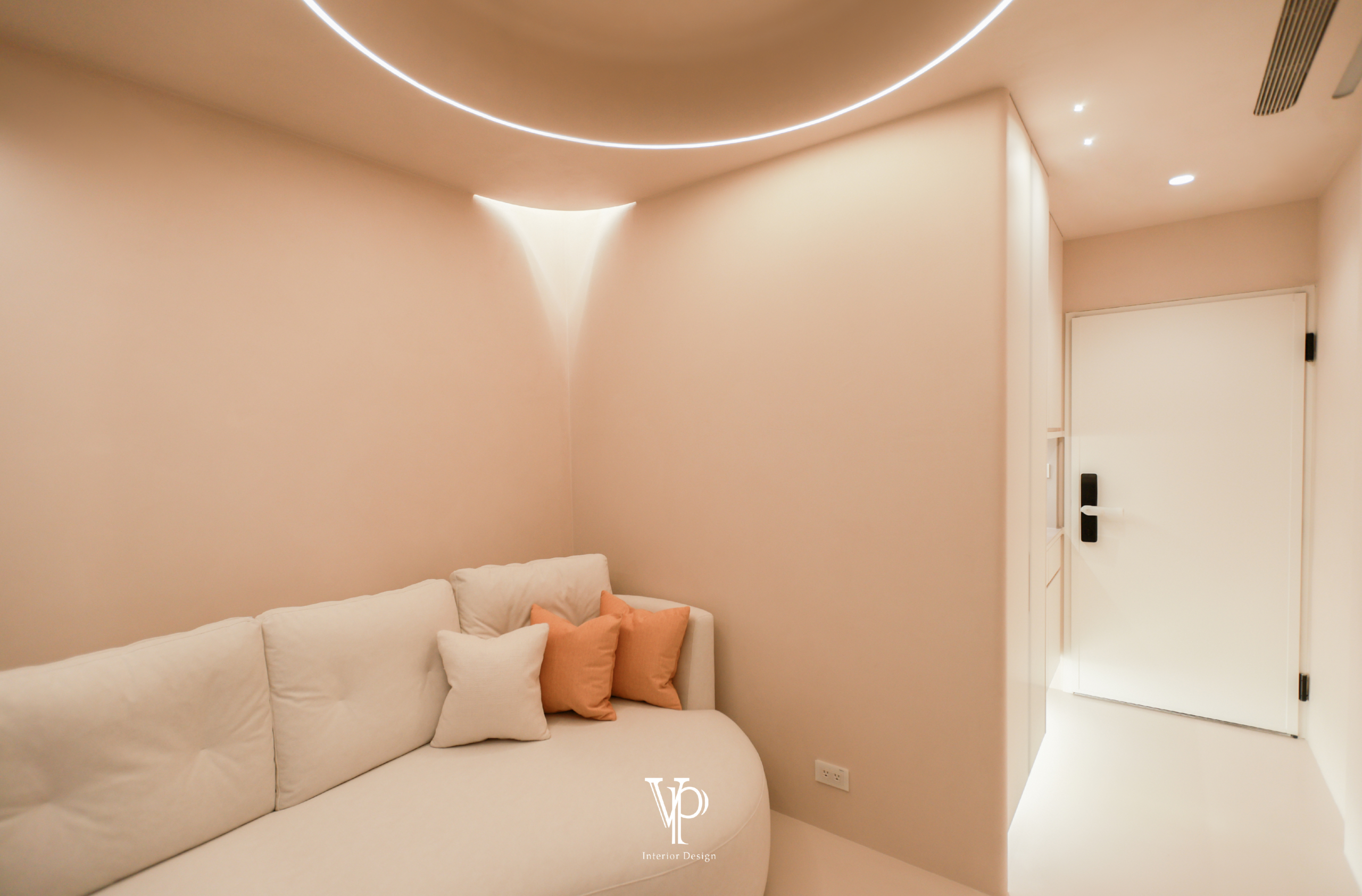 整體空間以低彩度米白為主軸,地坪、櫃體與天花板延續一致語彙,天花細刷特殊塗料,搭配無縫地板,模糊空間界線並放大整體尺度,使視覺自然延伸、流動。間接照明層層鋪陳,勾勒出兩人生活所需的靜謐與溫潤。