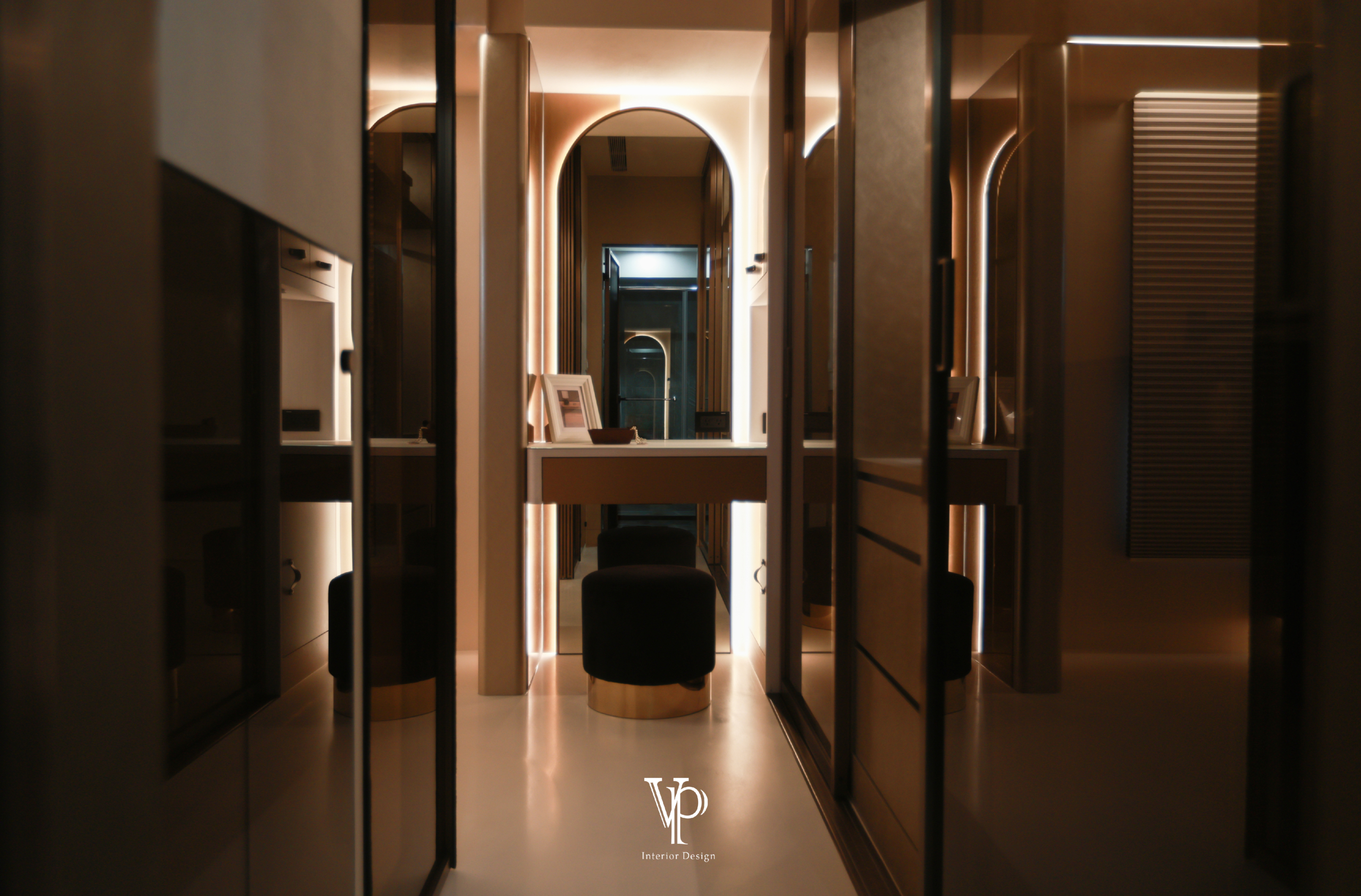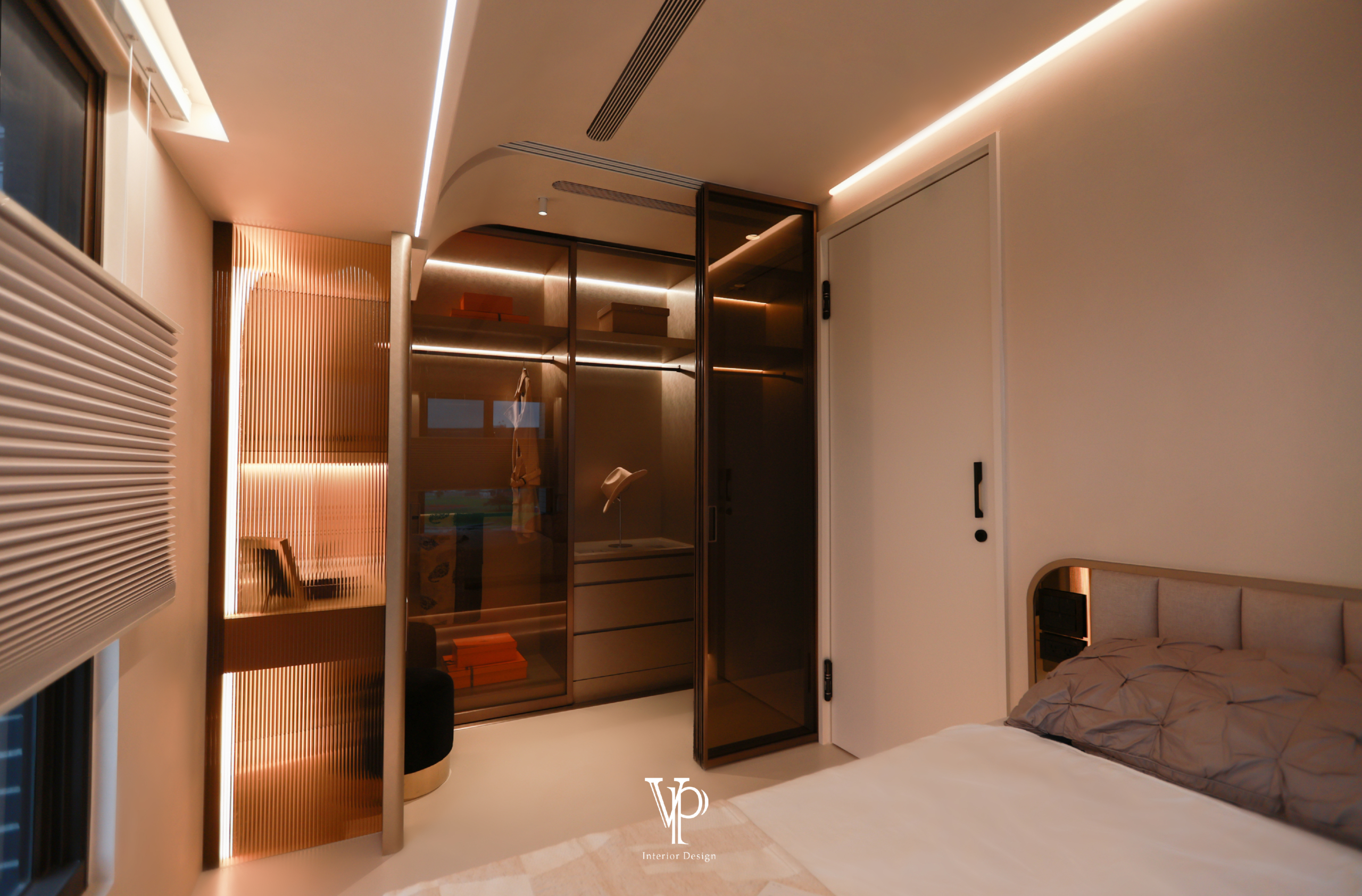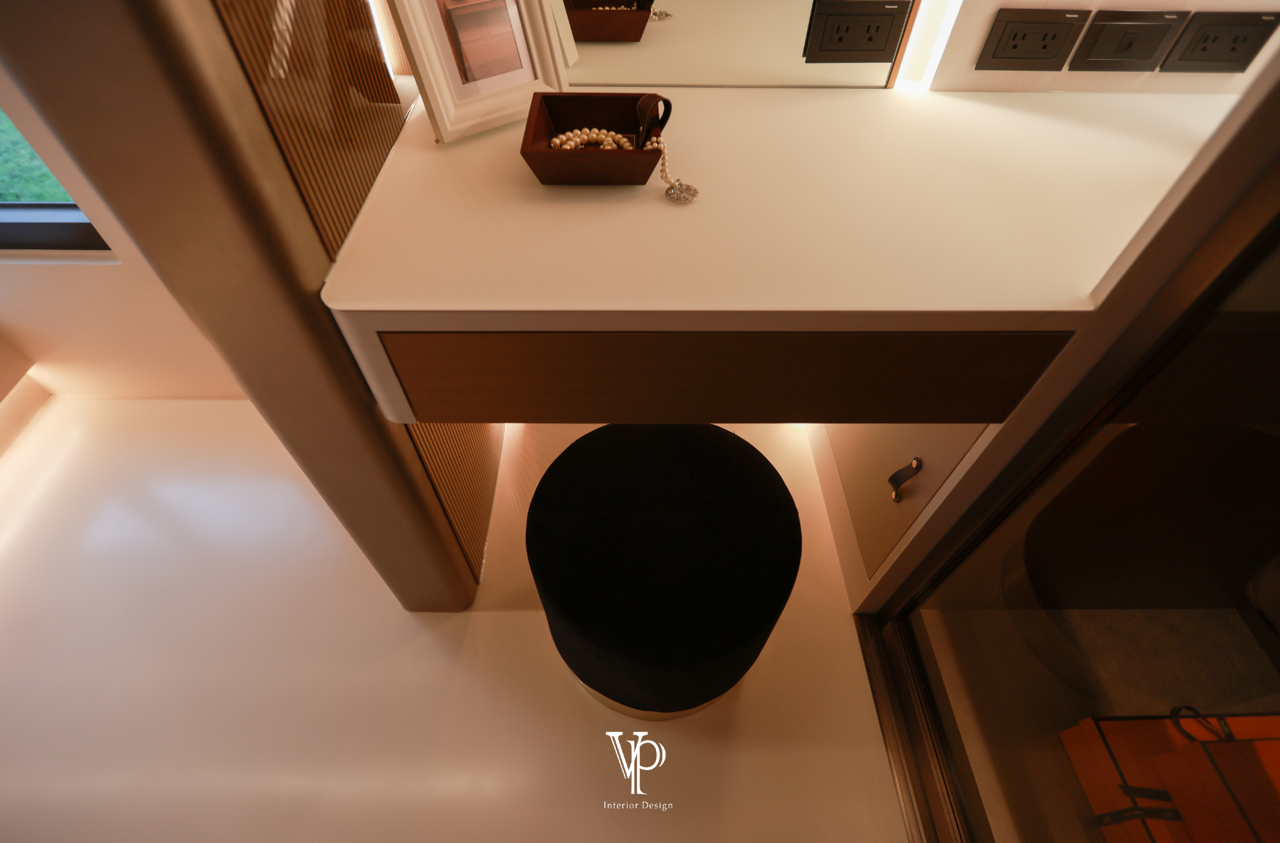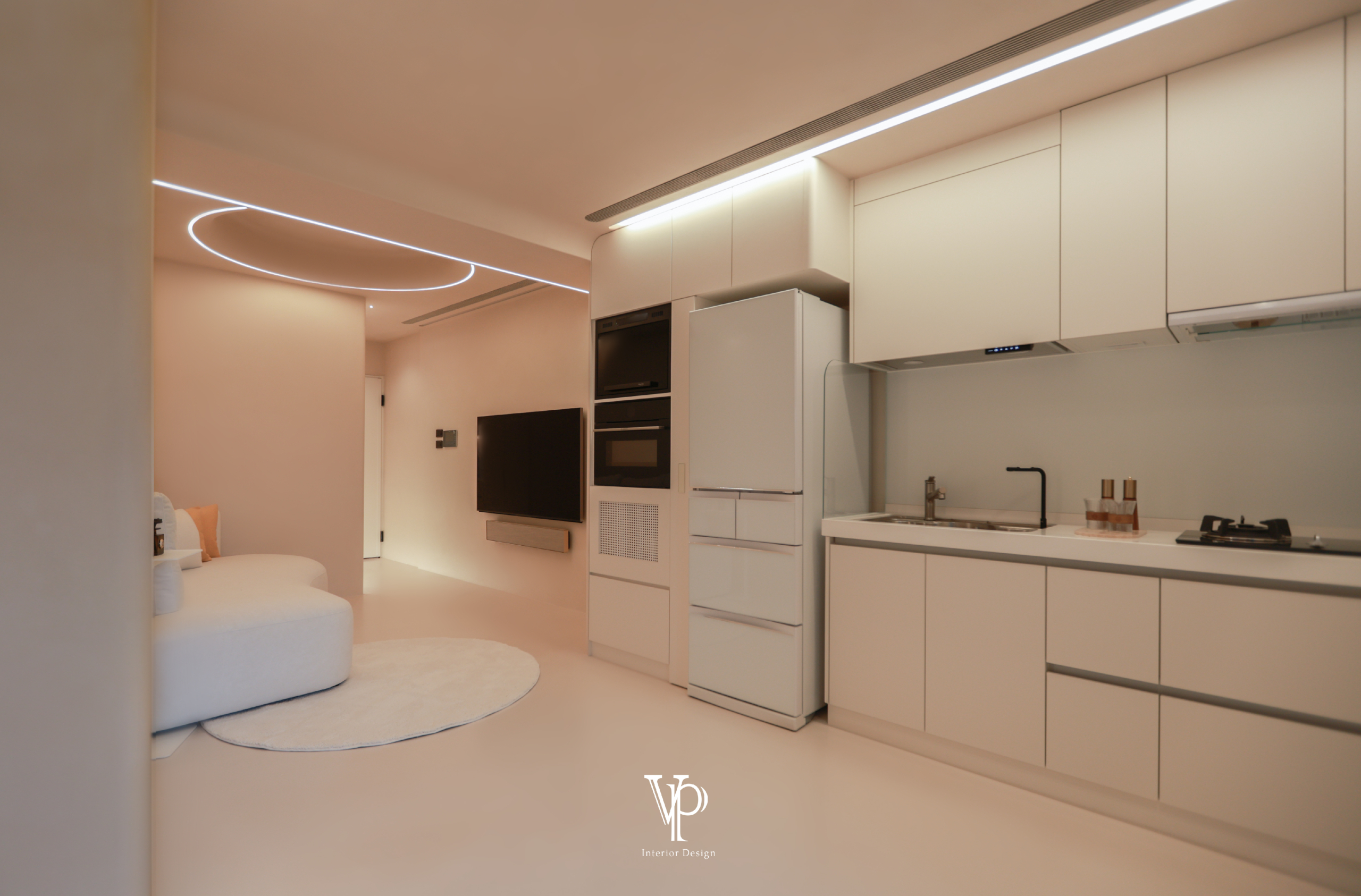 整體空間以低彩度米白為主軸,地坪、櫃體與天花板延續一致語彙,天花細刷特殊塗料,搭配無縫地板,模糊空間界線並放大整體尺度,使視覺自然延伸、流動。間接照明層層鋪陳,勾勒出兩人生活所需的靜謐與溫潤。