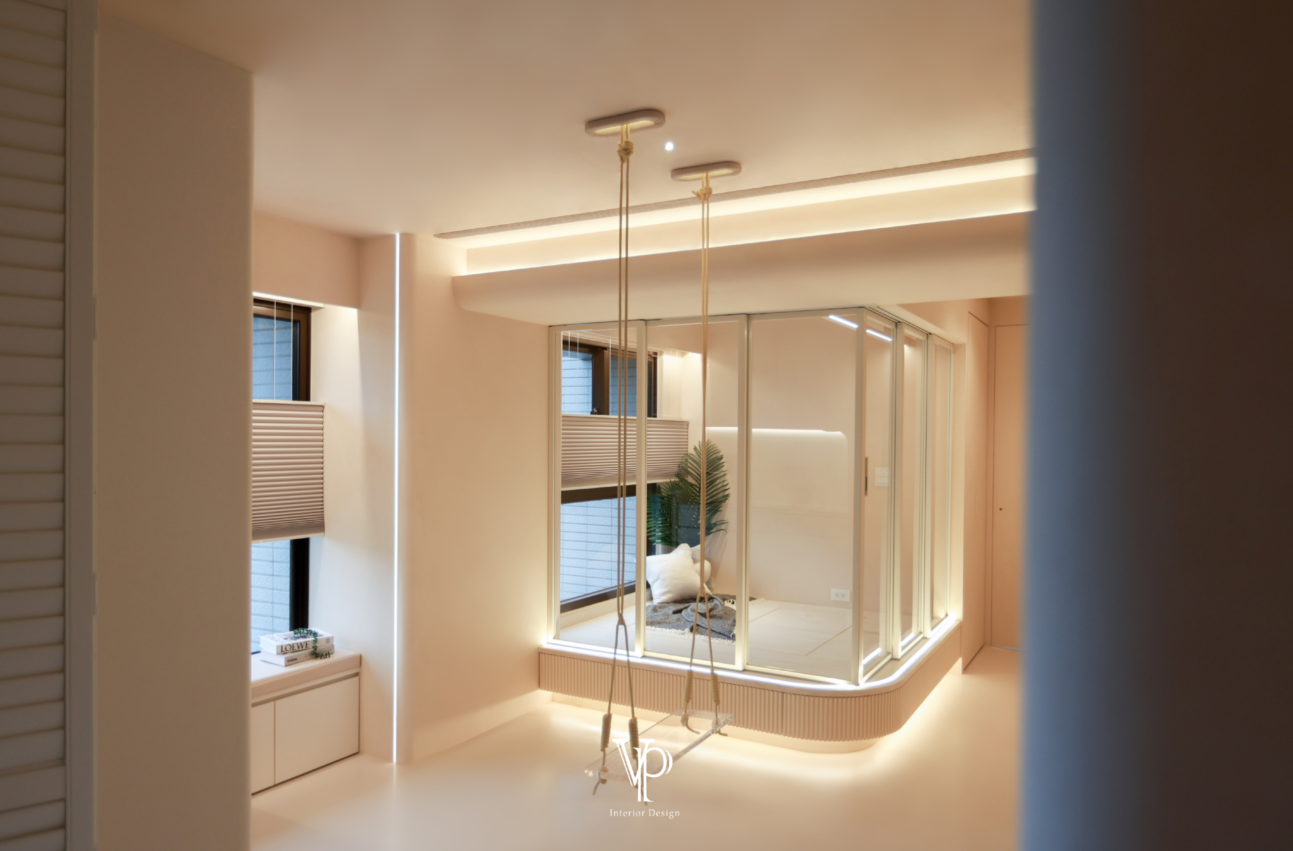 空間中特別規劃一座室內盪鞦韆,作為情感層面最具溫度的設計語彙。它不僅是玩樂的存在,更是一種讓身體與心緒慢下來的節奏裝置,在輕微的擺盪之間,回應居者對生活鬆弛感與安定感的期待。