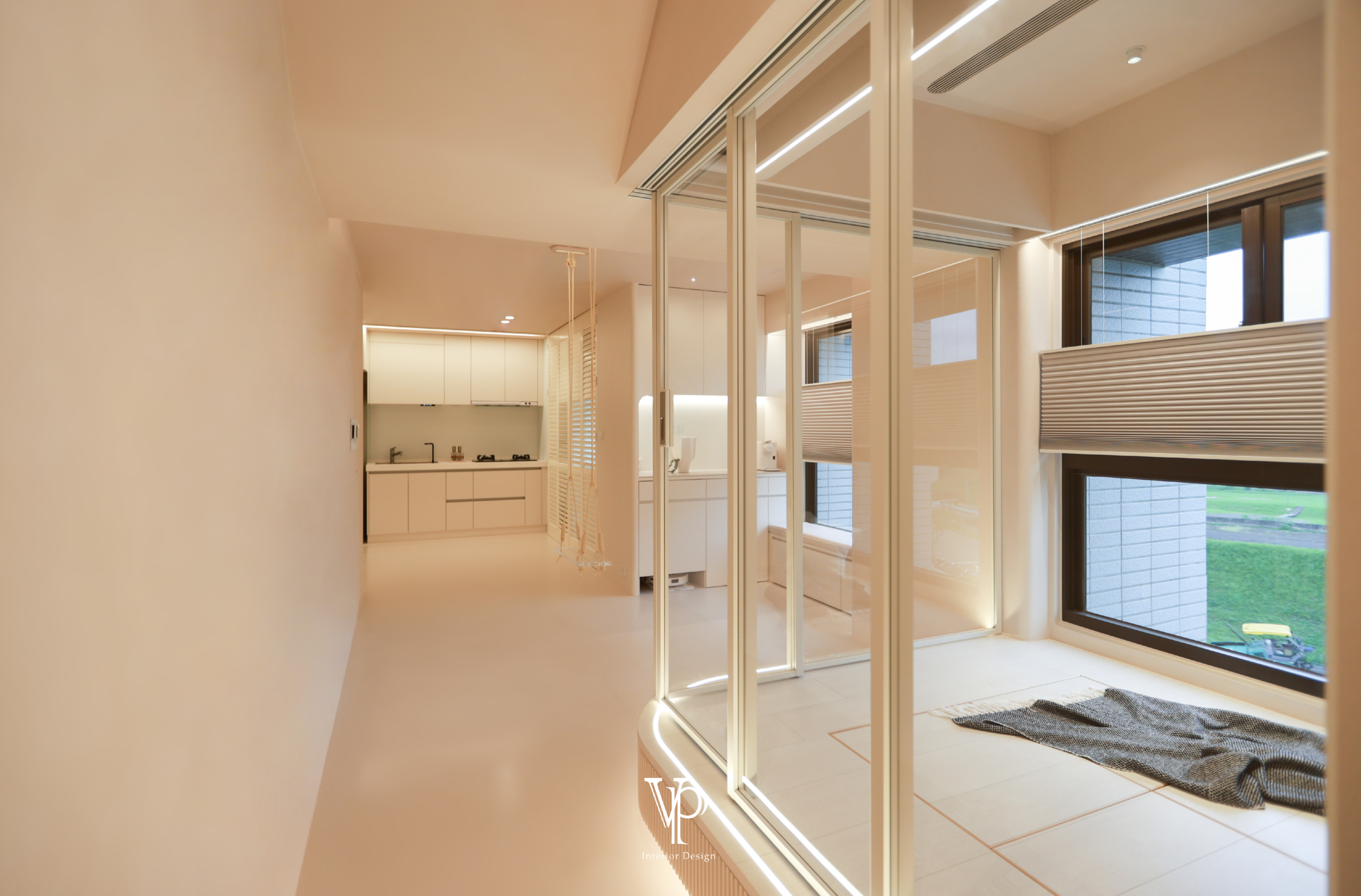 以間接照明結合自然採光與木百葉,柔化空間層次,讓光影隨生活輕柔流動。