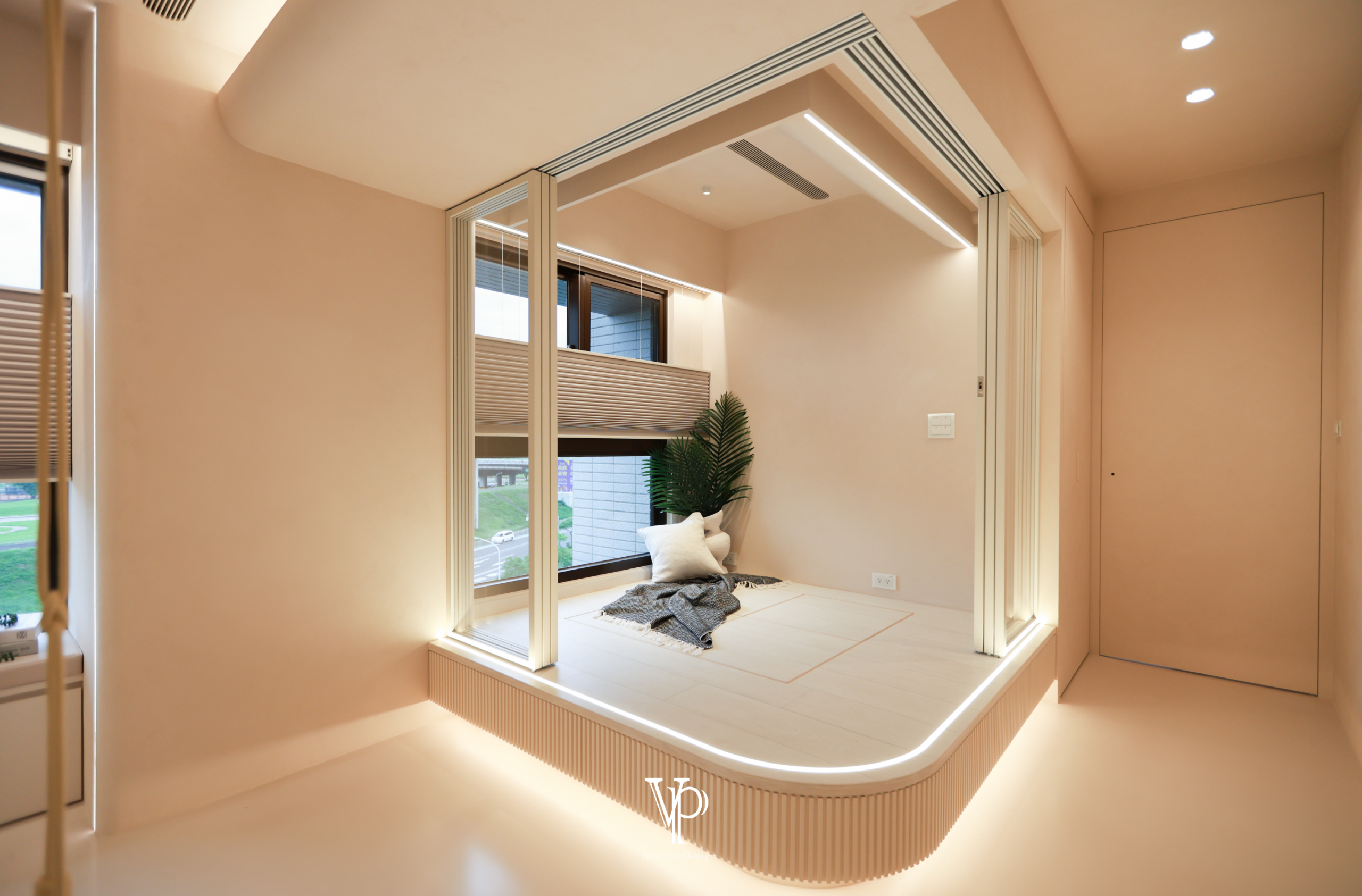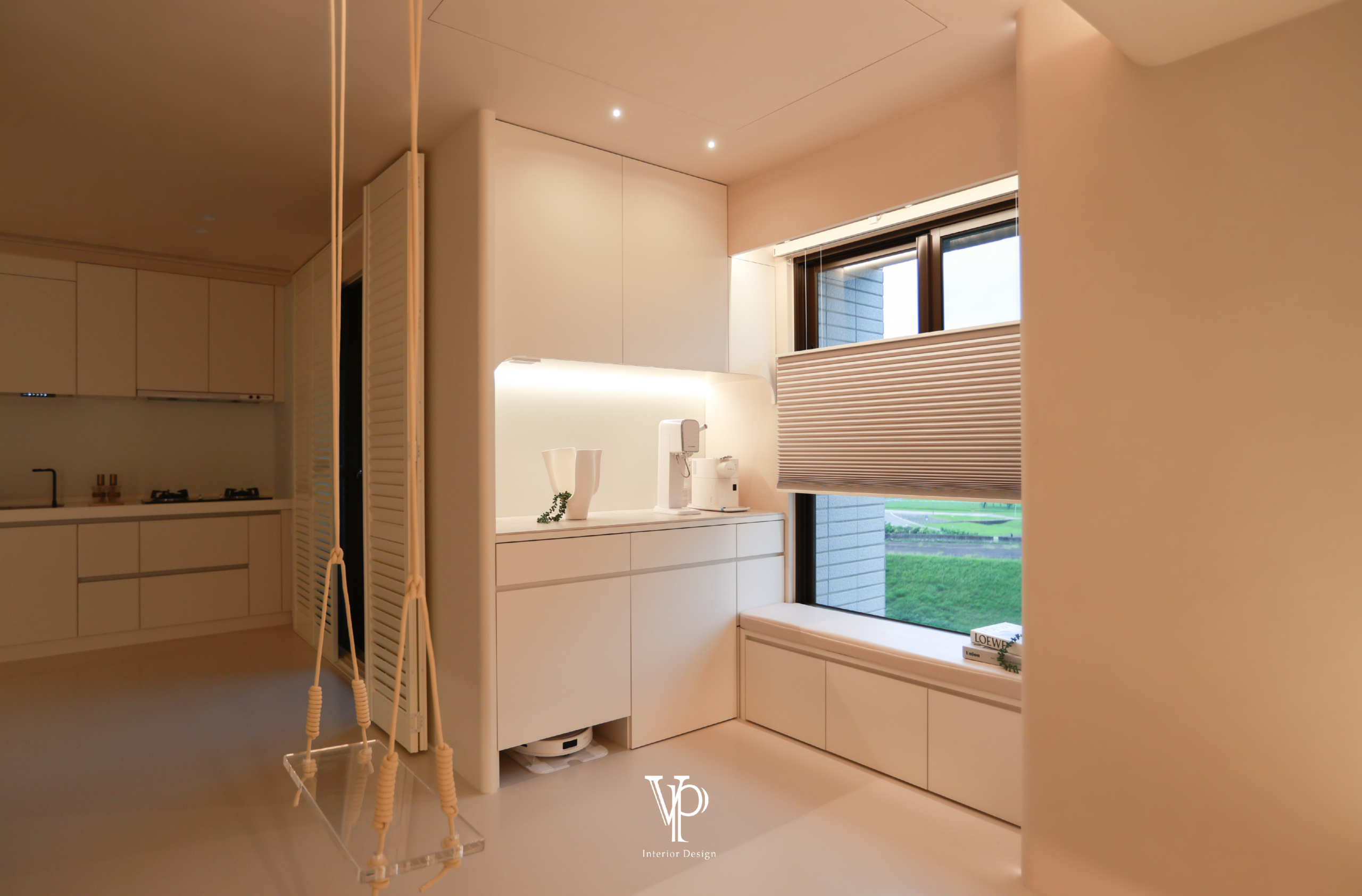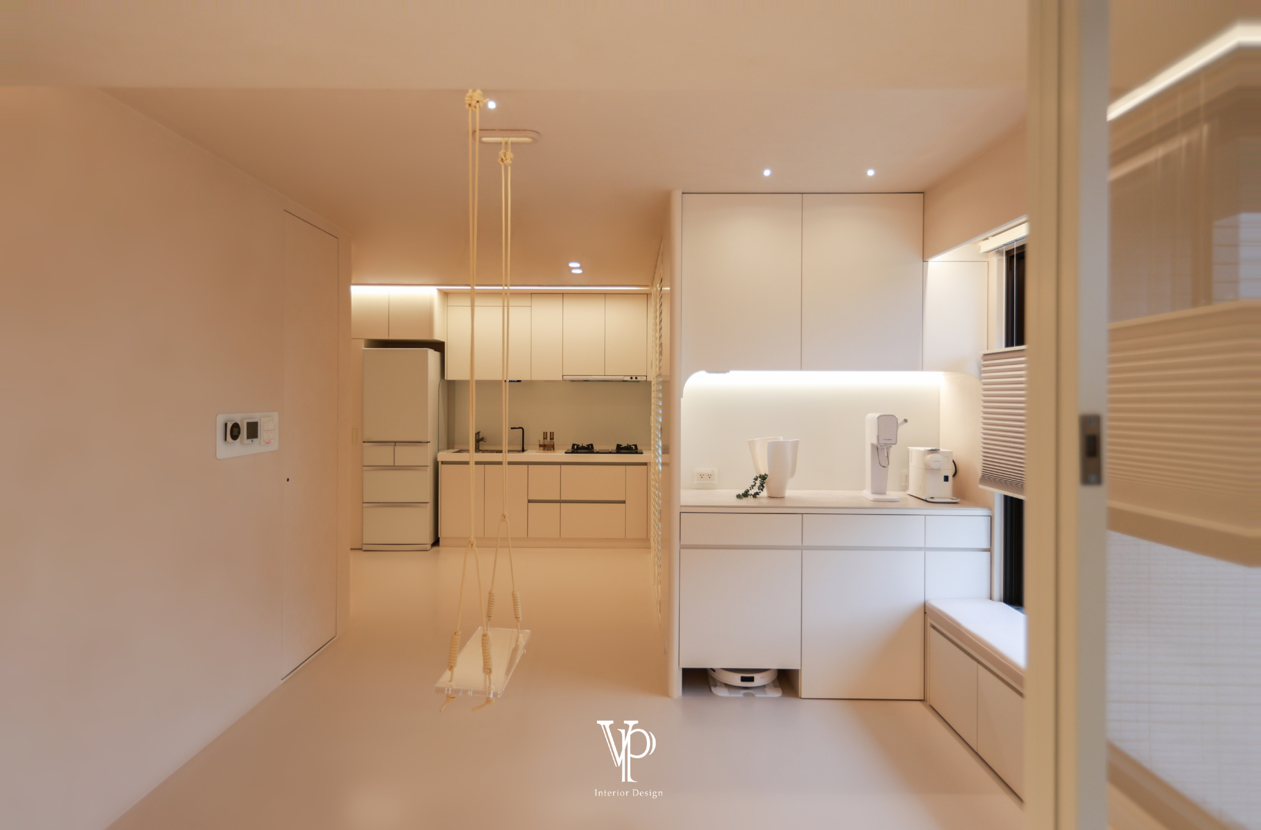 全室以低彩度米白統一牆面、櫃體與天花,使空間純淨延伸,盪鞦韆自然融入其中。