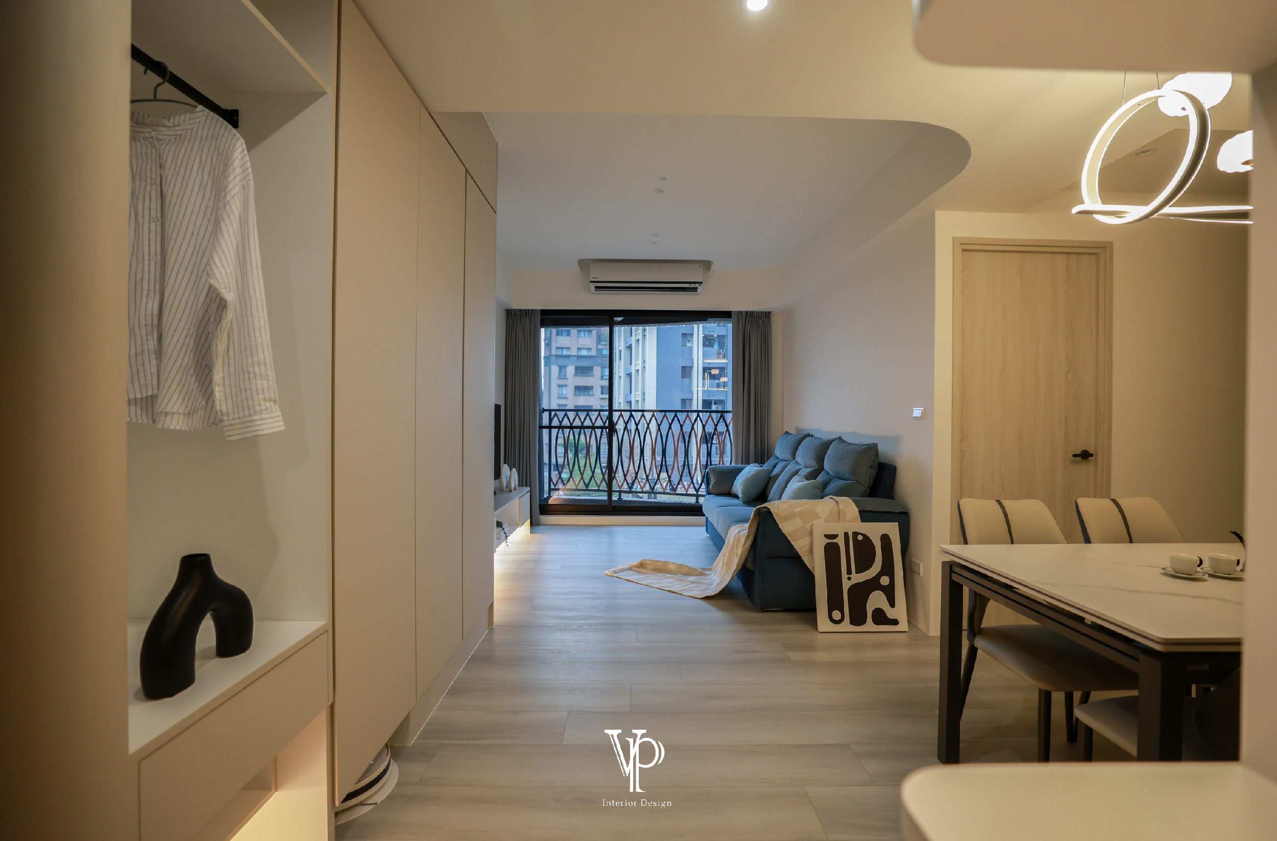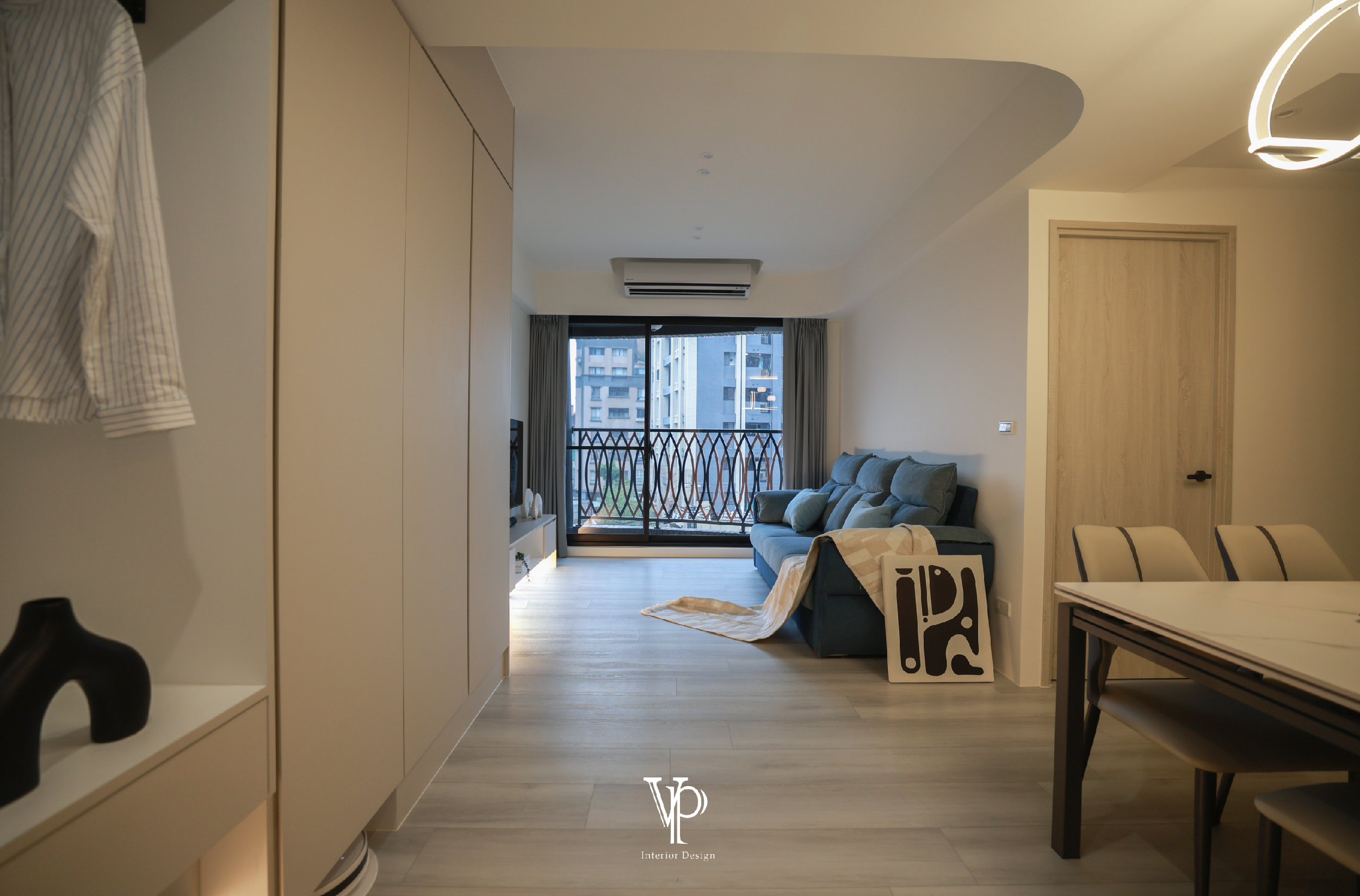 ② 風格定位|以純白為主軸,搭配淺木門片、灰系地坪與深色鐵件線條,呈現清爽、沉穩且具溫度的現代風格。