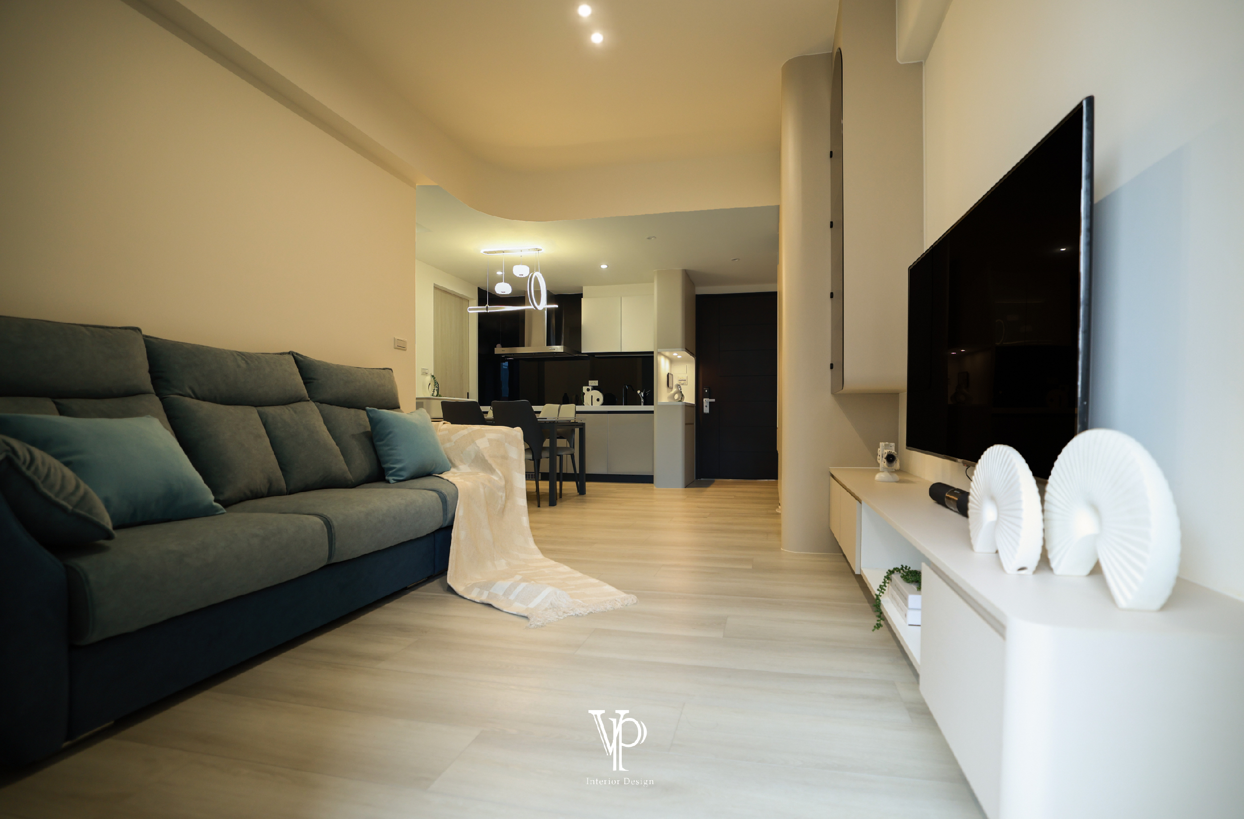 ① 空間配置|開放式客餐廳以弧形天花、懸浮家具與通透採光延伸視覺,使小坪數也能展現大視野。