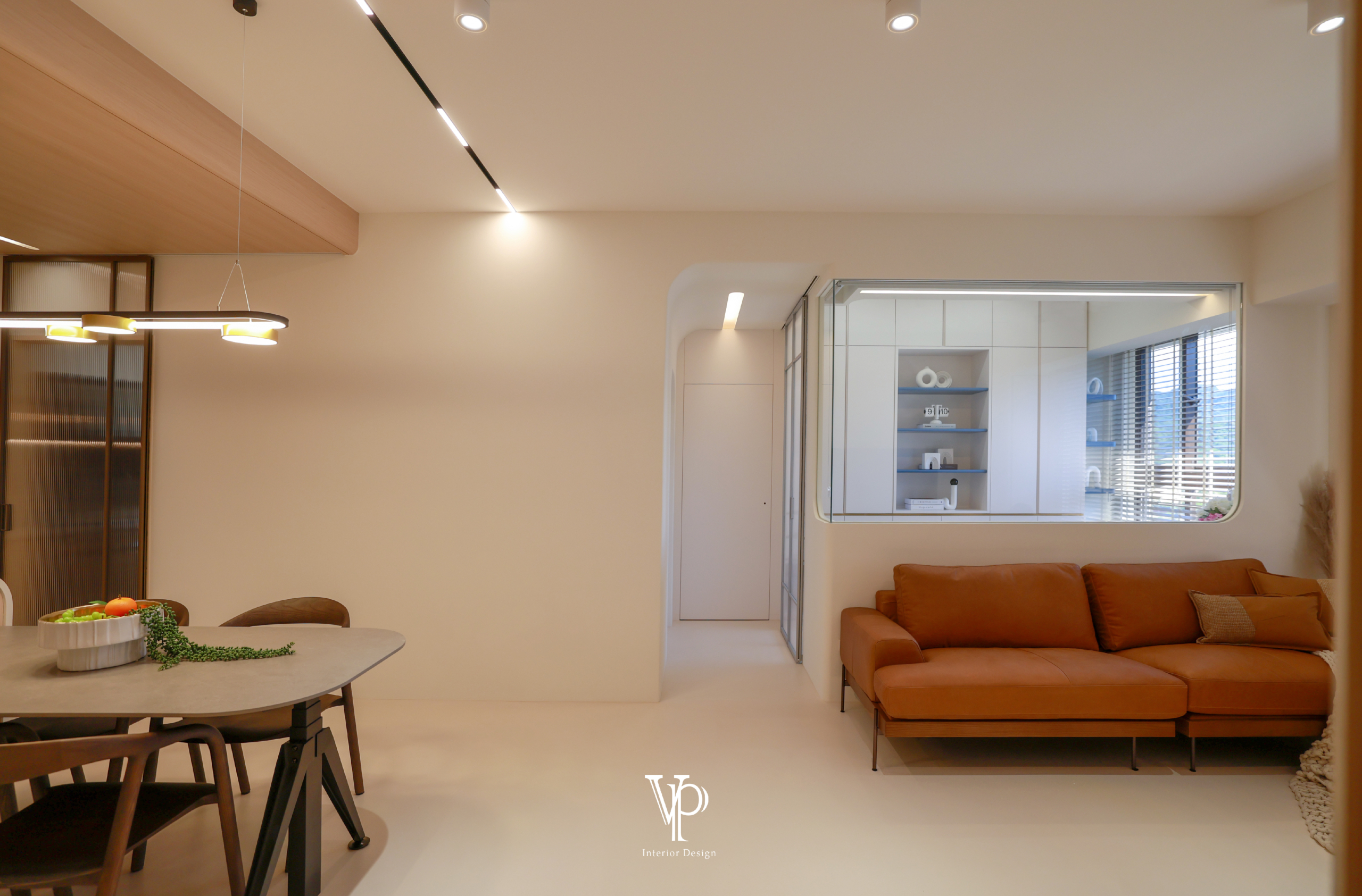 設計融合無印風的木質調與北歐的簡約清新,玄關與用餐區採用木紋元素,並以天花高度微調形成與客廳的自然分界。客廳則以白色與淺灰色為基調,營造明亮沉穩的氛圍。