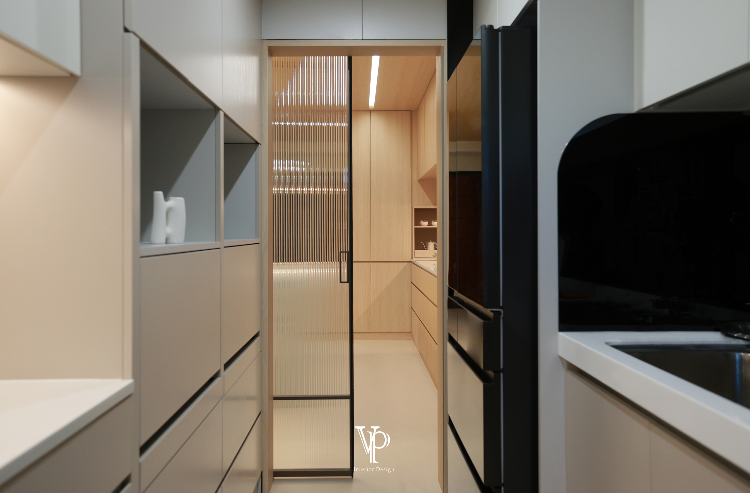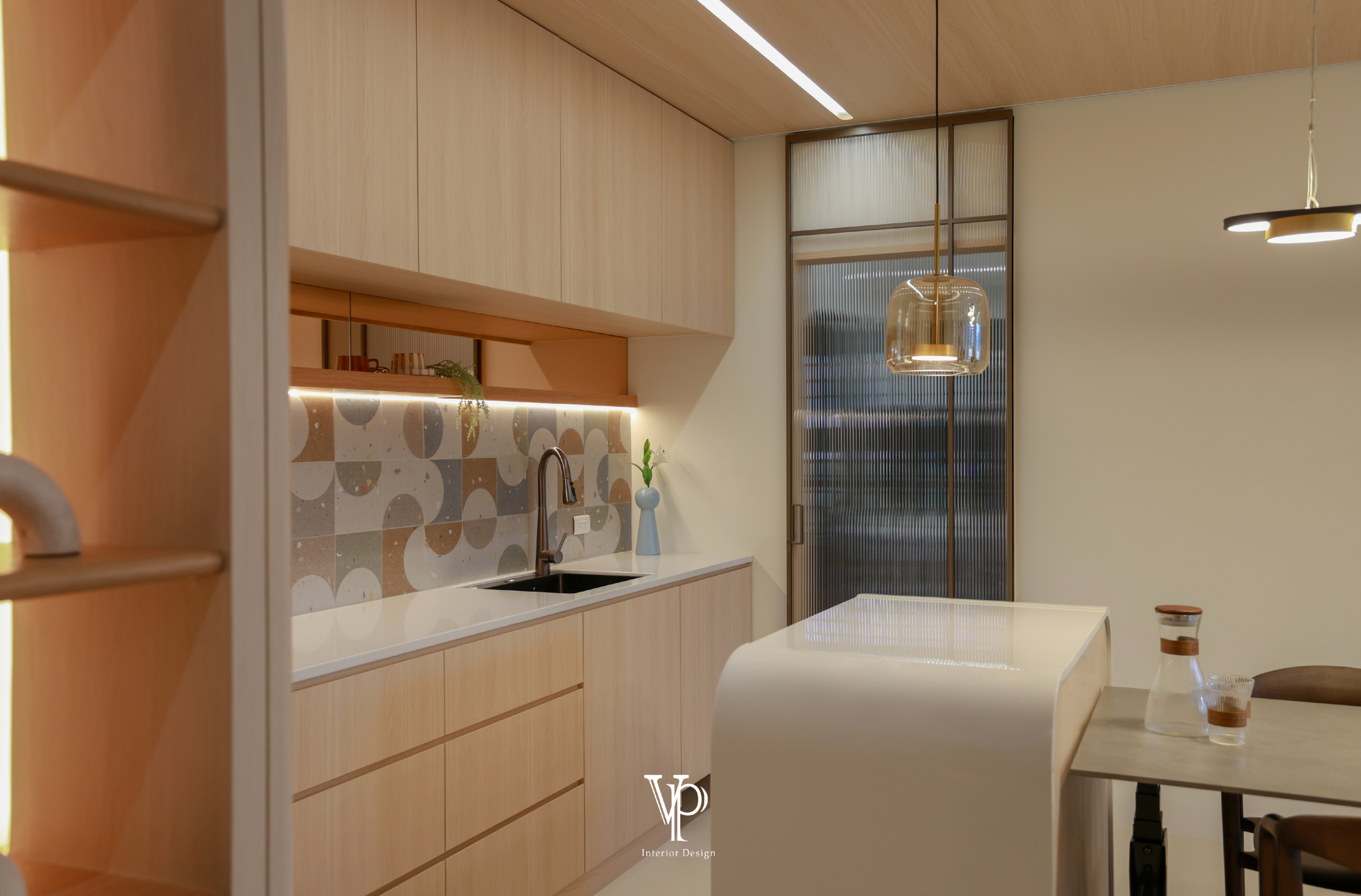 用餐區旁設置了一整排收納櫃,搭配中島與輕食備餐區,備餐區採開放設計並以趣味磁磚點綴,兼具實用與美感。臥室設計延續簡約舒適,小孩房為淺奶茶色,增添活力與童趣。