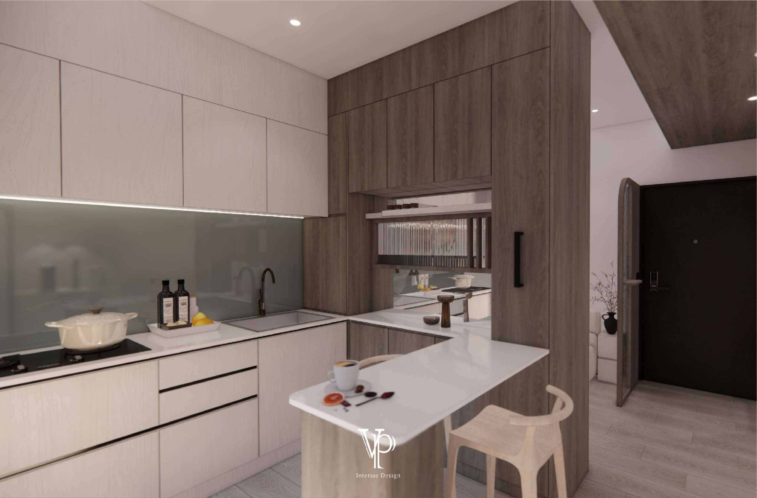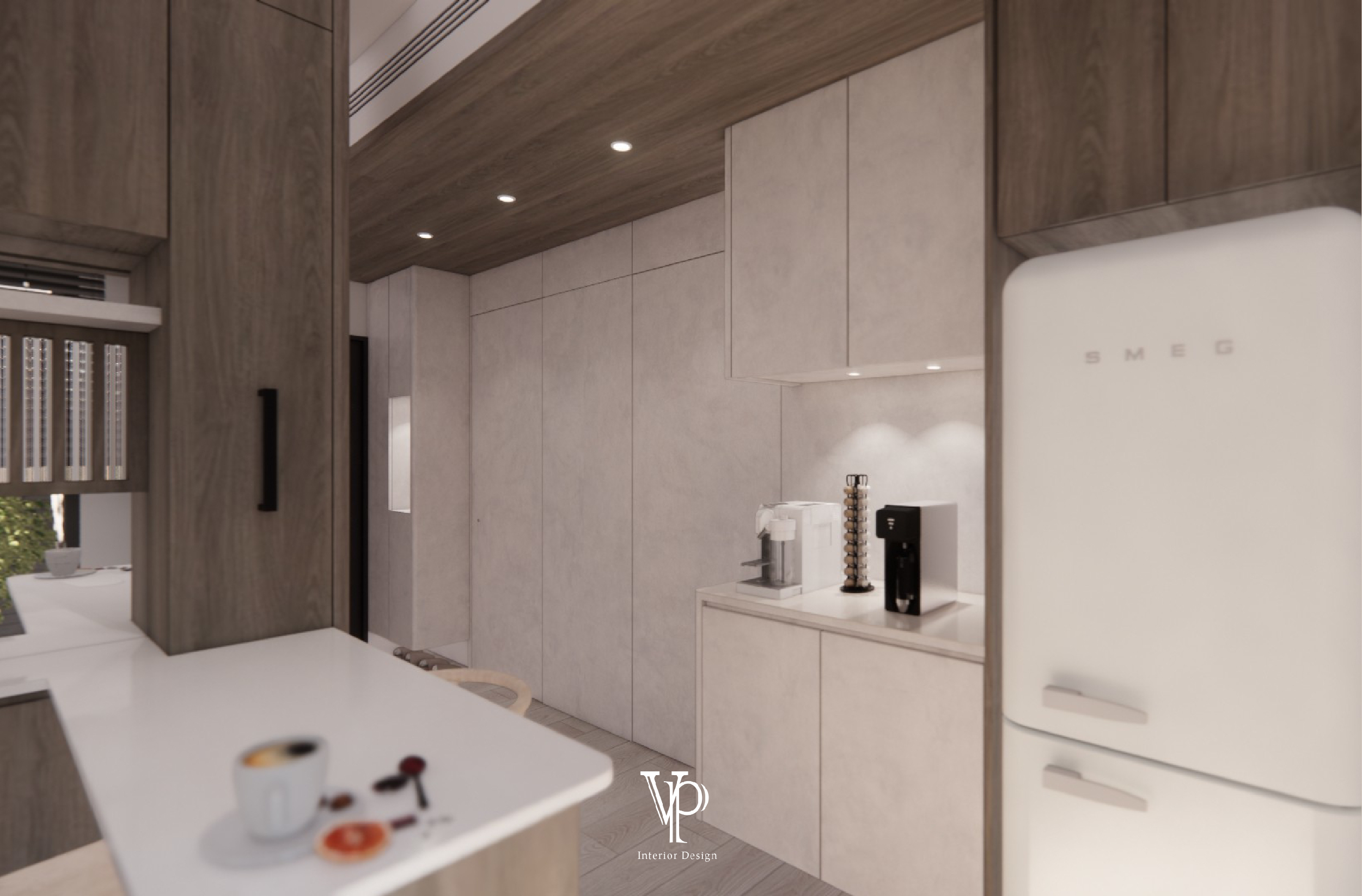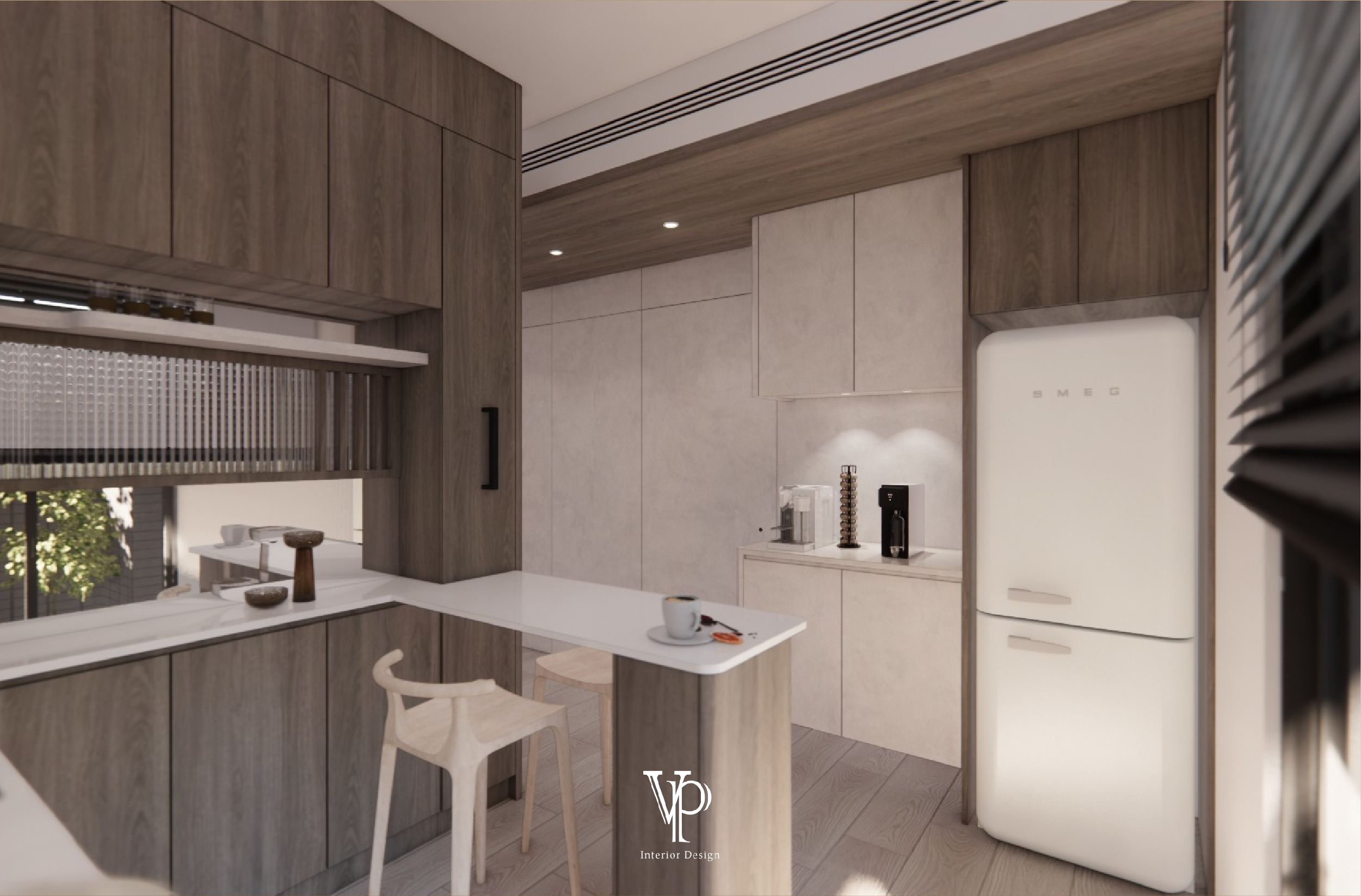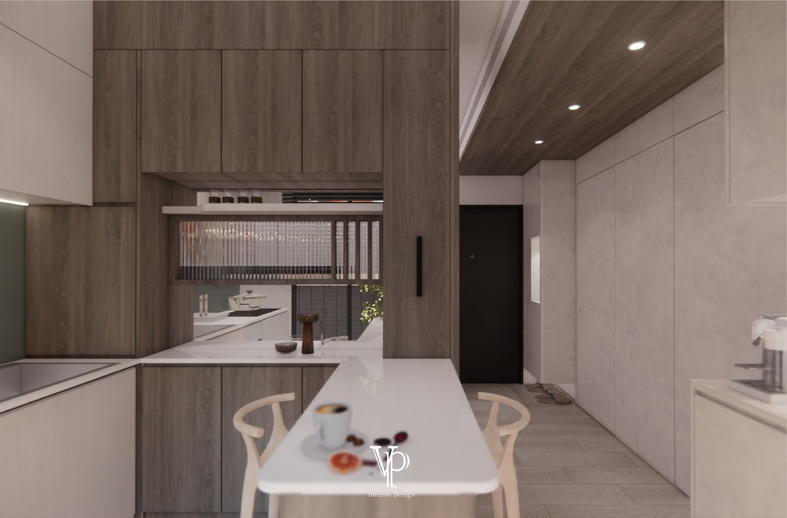 仿水泥塗料為主體,結合深胡桃木皮、黑色烤漆與長虹玻璃;地坪與中島以暖色材質搭配石材檯面平衡整體溫度。