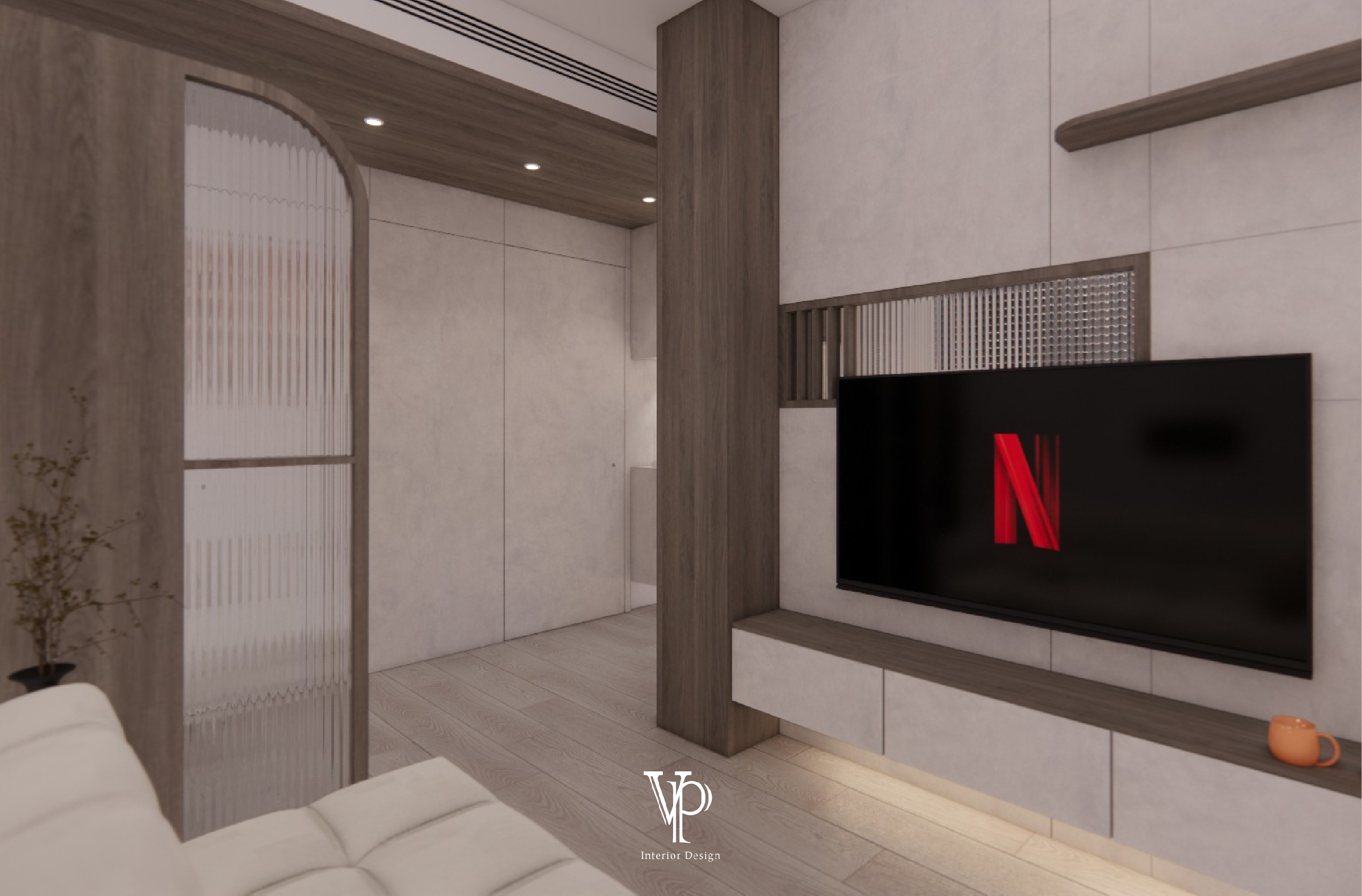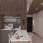 色彩上以大地灰與深木色為主軸,延伸至公領域的安定感受,並於私領域轉為明亮純淨,使生活情緒自然過渡。光線規劃則以間接照明與自然採光為輔,透過格柵與玻璃取光並轉化光影,讓空間在細節中展現靜謐質感。