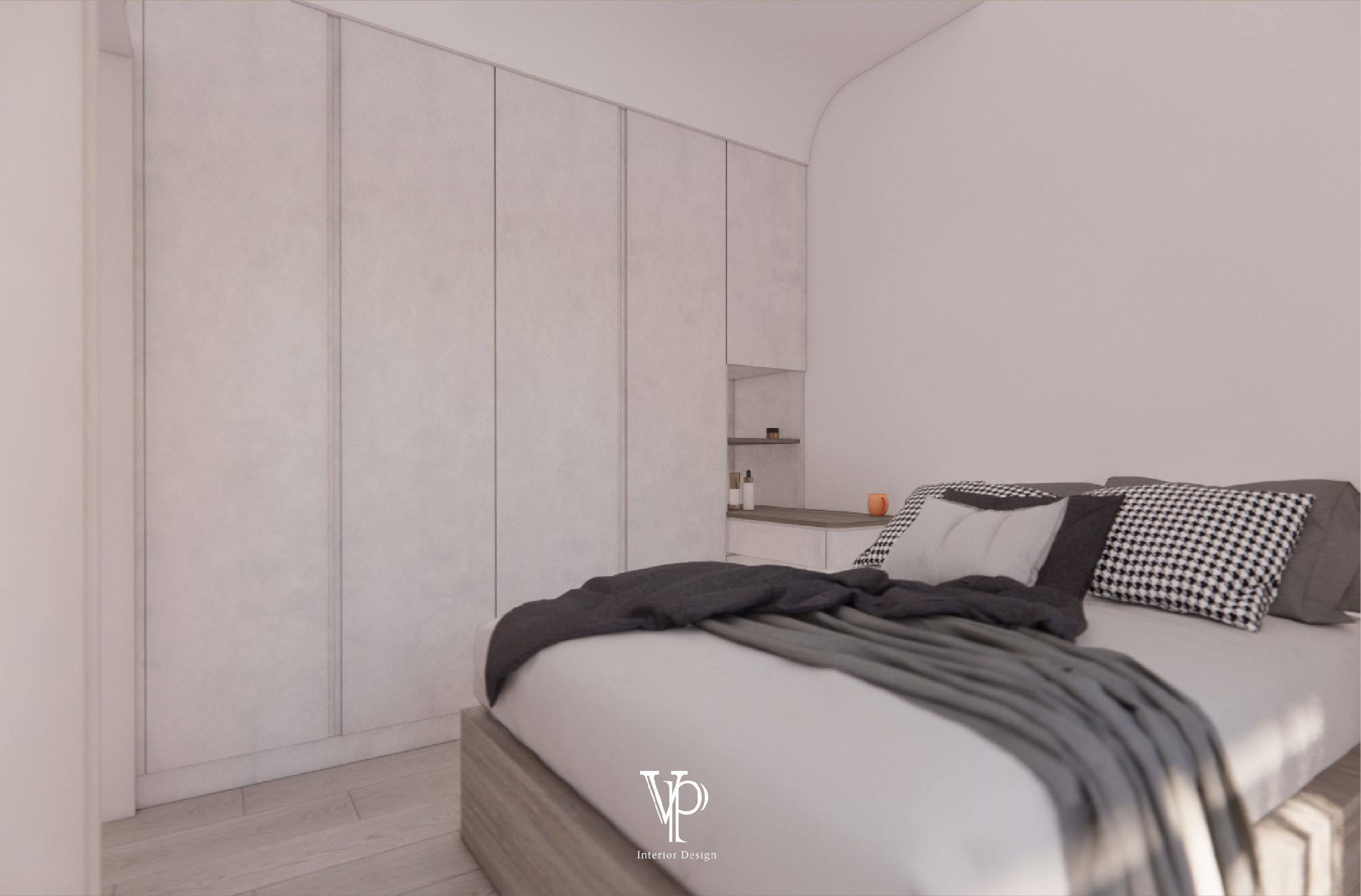 現代極簡風格,以俐落線條搭配深木質與淺灰牆面,強調「隱」與「靜」的內斂氛圍。