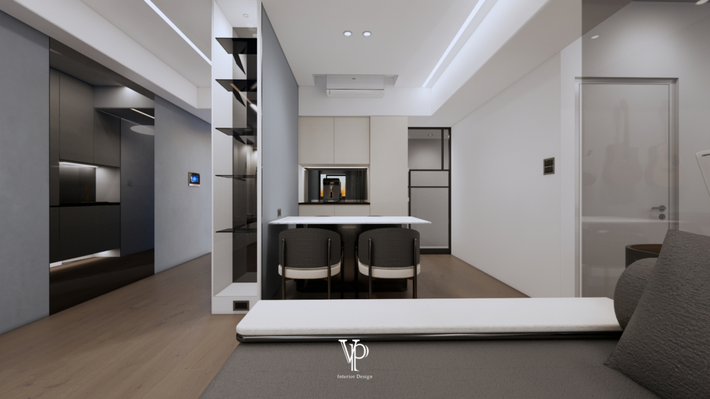 全室以灰階中性色調鋪陳,形塑乾淨俐落的設計語彙與沉穩理性的空間性格。光影在不同的灰色層次間緩緩移動,使極簡風格不再冷硬,而是保有內斂的律動感與視覺開闊度,兼顧美感與實用需求。